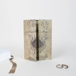 Sumérgete en el mágico mundo de Harry Potter con nuestra exclusiva invitación «Mapa del Merodeador». Diseñada meticulosamente para capturar el espíritu aventurero y encantador de la serie, esta invitación es perfecta para las parejas que desean agregar un toque de magia a su boda. El diseño está inspirado en el icónico Mapa del Merodeador y presenta detalles intrincados y acabados de alta calidad que evocan el misterio y la elegancia del mundo mágico.