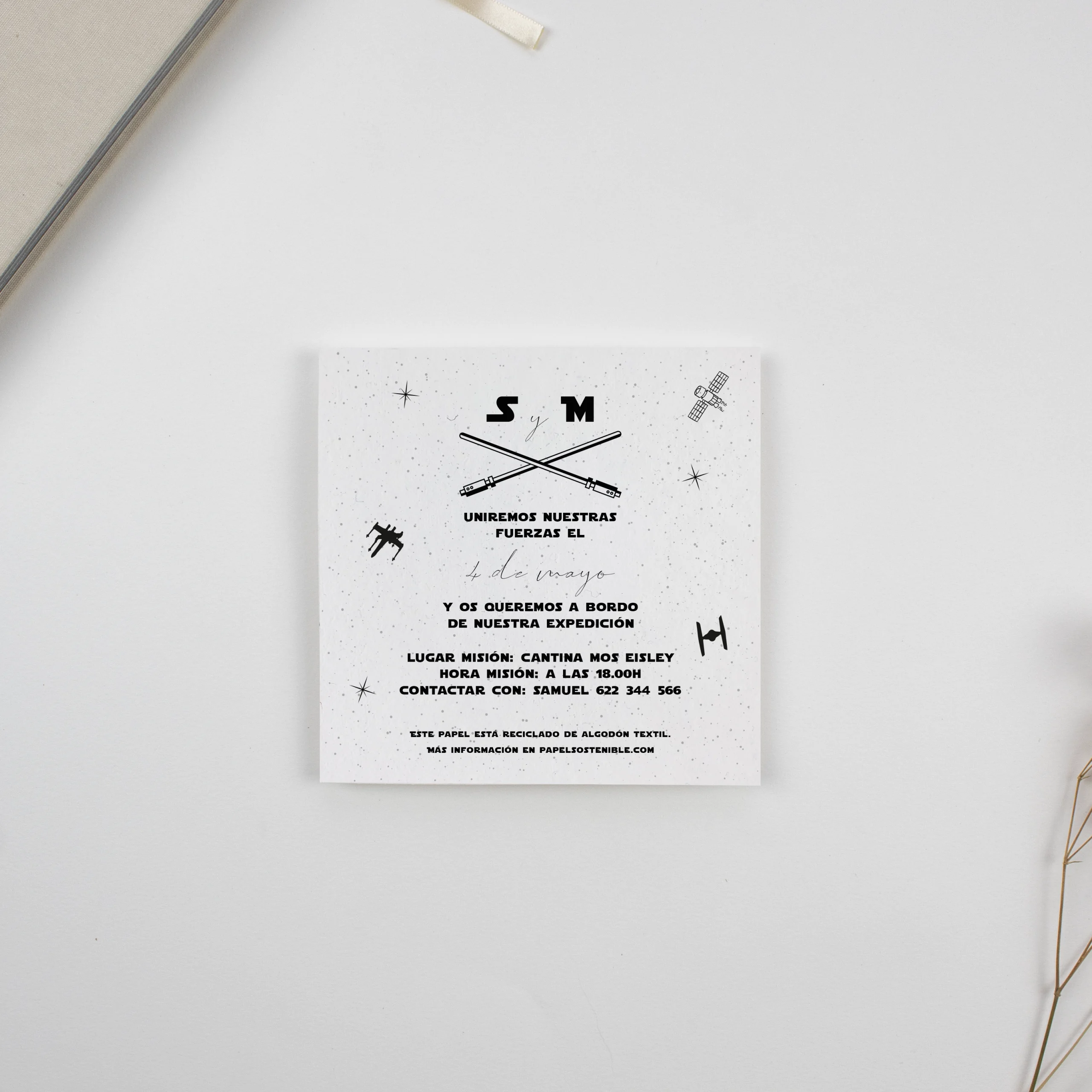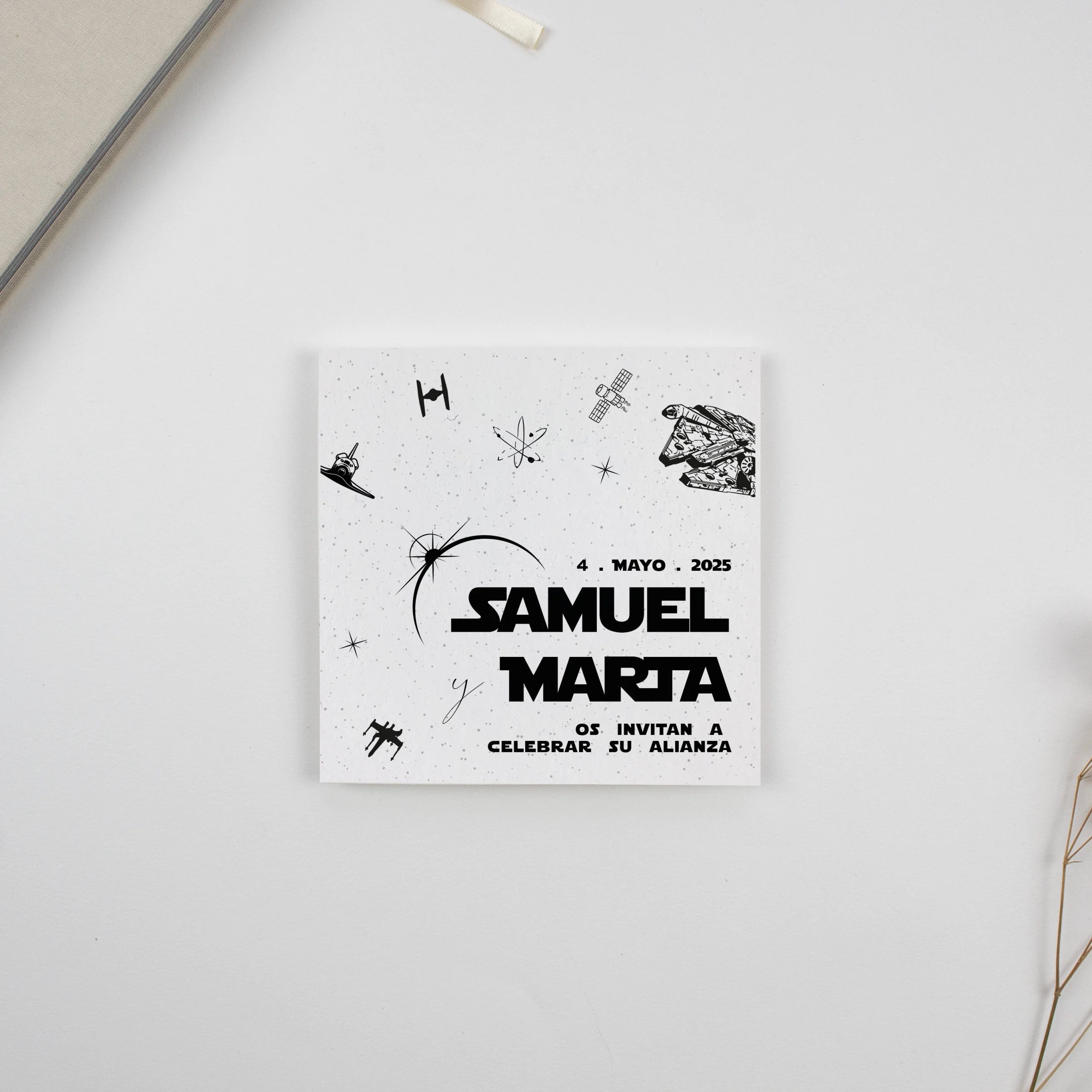 Presentamos nuestra creación más reciente: la Invitación de Boda Galaxia. Inspirada en la majestuosidad de Star Wars, esta obra maestra fusiona la magia de la galaxia con la elegancia de una invitación de boda, ofreciendo a las parejas una forma única de anunciar su amor cósmico. Imaginada con meticulosidad, la Invitación de Boda Galaxia cuenta con un diseño que transporta a los novios y a sus invitados a una galaxia muy, muy lejana. El papel cósmico, salpicado de destellos plateados y dorados, crea un fondo celestial que captura la esencia del espacio exterior.
