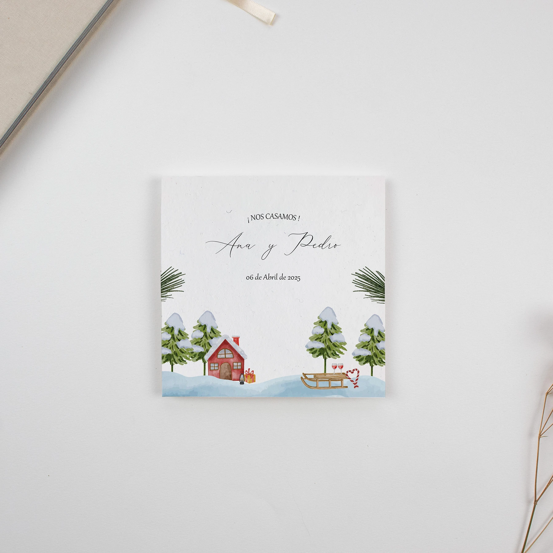 La invitación de boda Navidad es una oda encantadora a la temporada festiva, capturando la esencia misma de la celebración del amor en medio del invierno. Su diseño meticuloso en acuarela trae consigo un toque de elegancia que no solo resalta la belleza del invierno, sino que también agrega un elemento personal y artístico a la invitación.